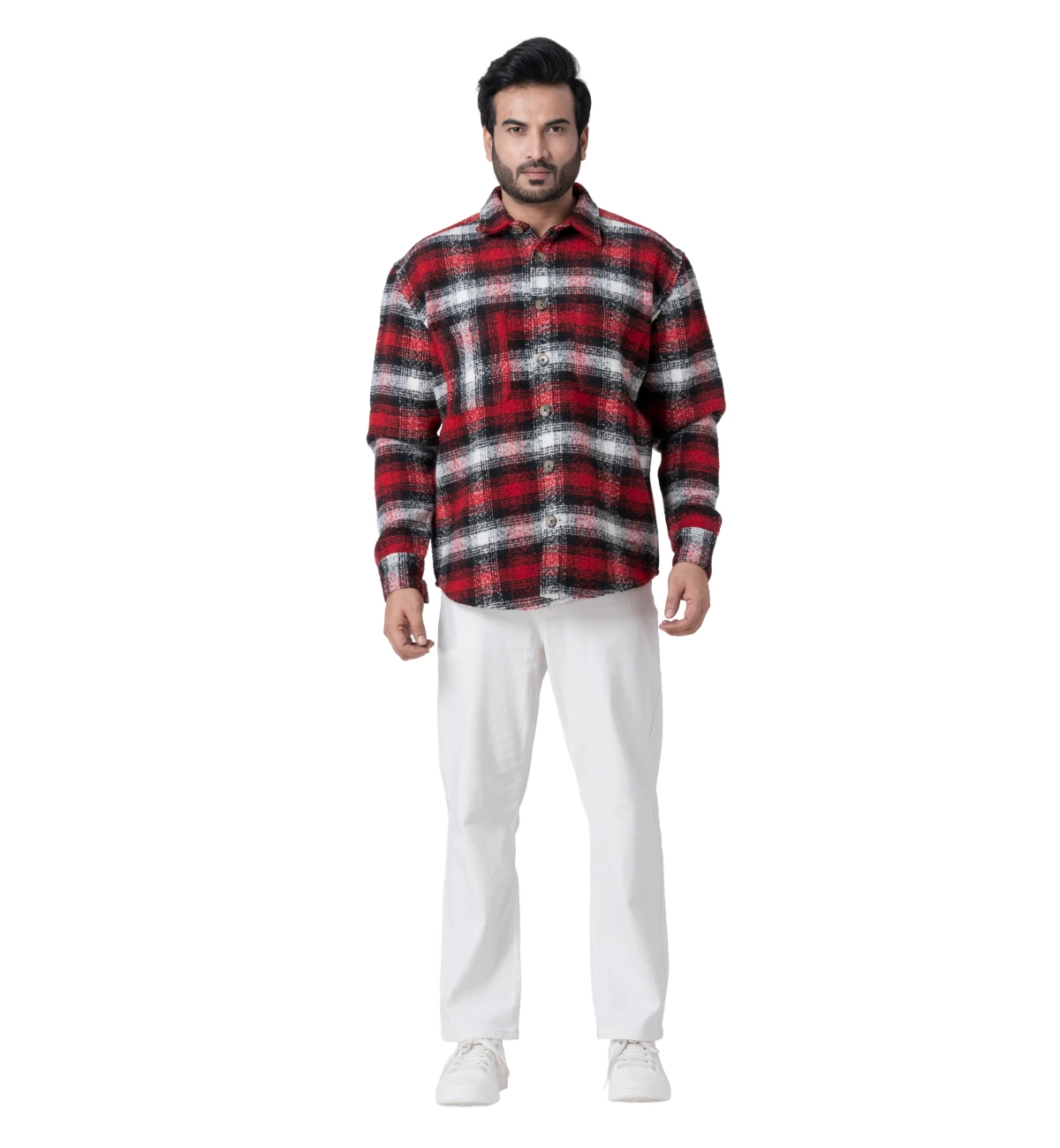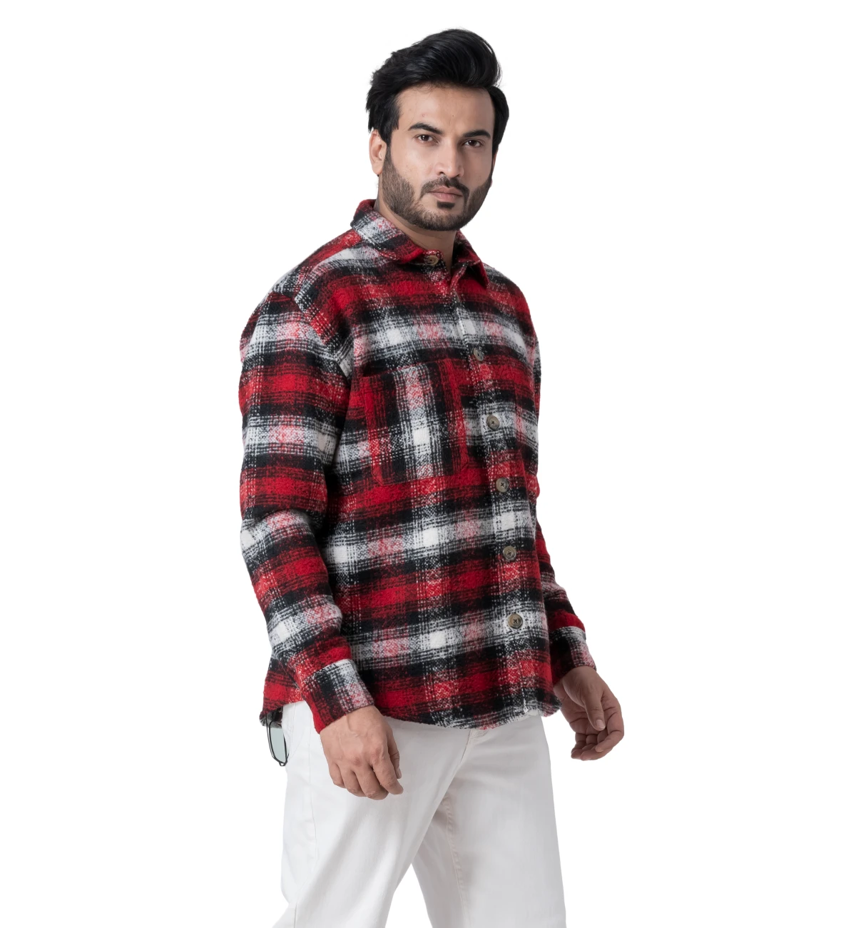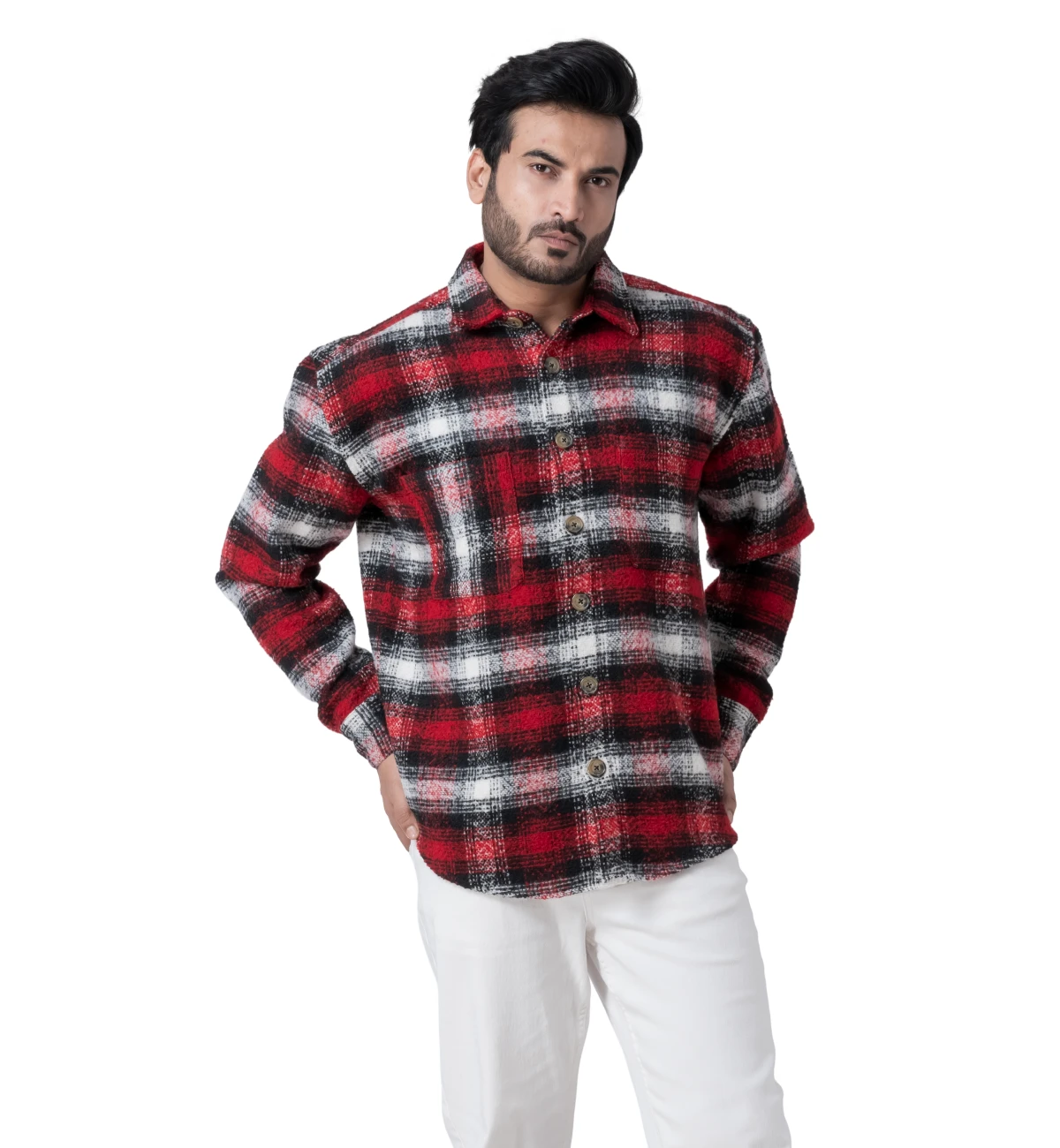 Warm and comfortable full-sleeve woollen shirt designed in a classic red checked pattern for winter wear. The soft, insulating texture makes it ideal for colder climates while maintaining a clean, outdoorsy aesthetic. Colour and pattern variations can be created as required. Customisation available.