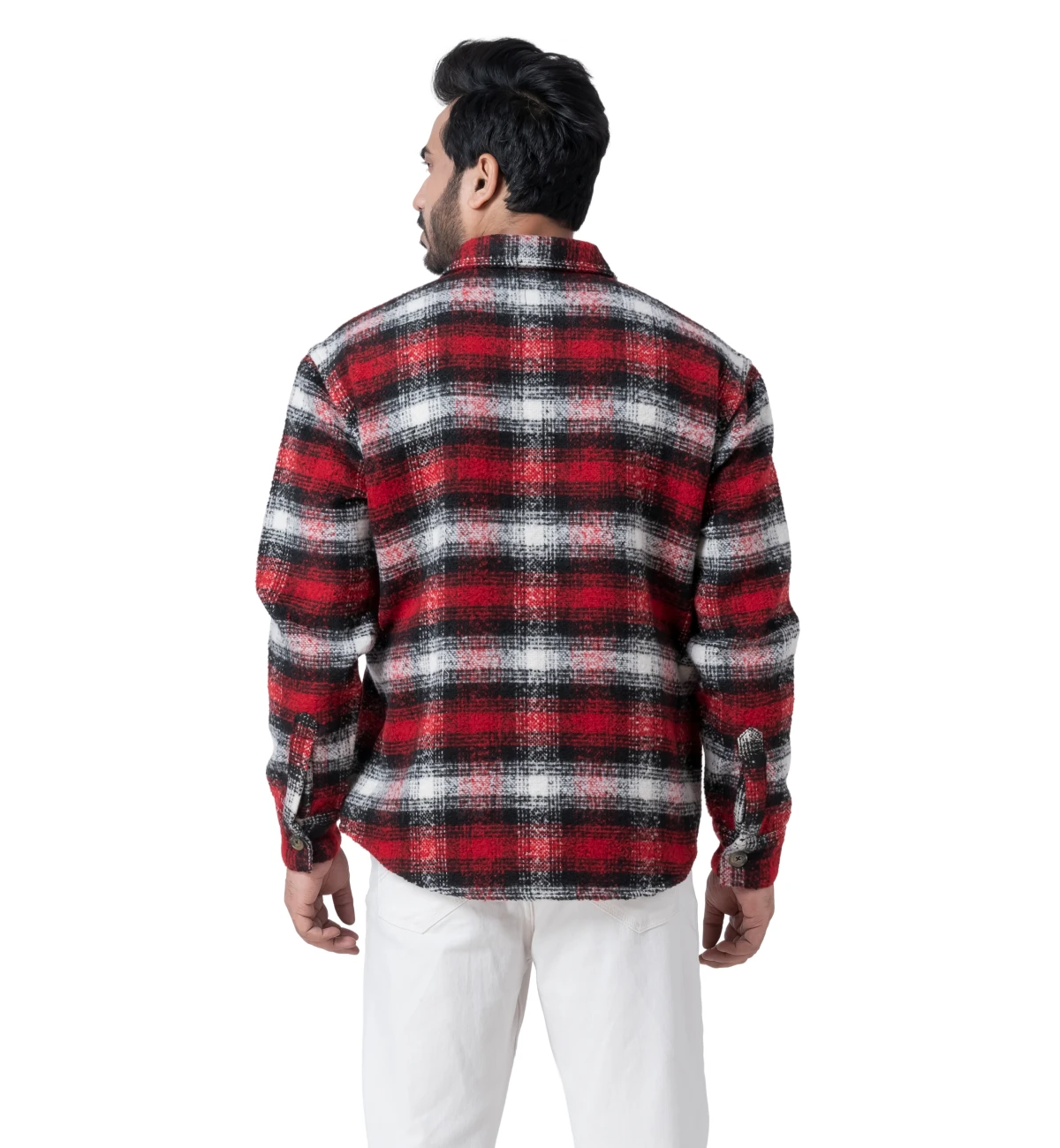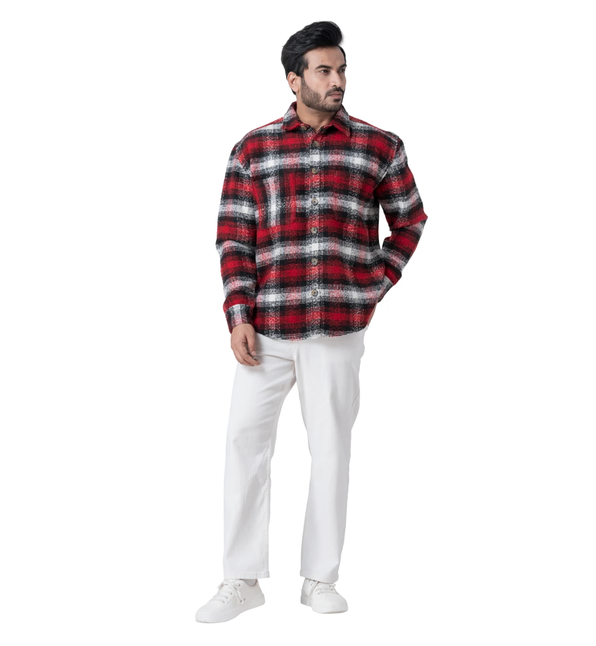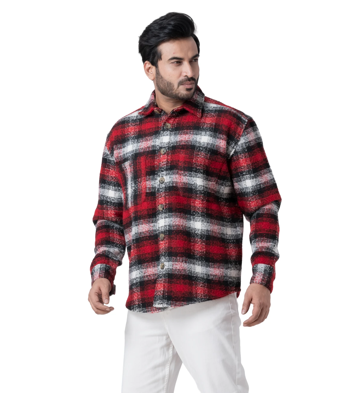 Warm and comfortable full-sleeve woollen shirt designed in a classic red checked pattern for winter wear. The soft, insulating texture makes it ideal for colder climates while maintaining a clean, outdoorsy aesthetic. Colour and pattern variations can be created as required. Customisation available.