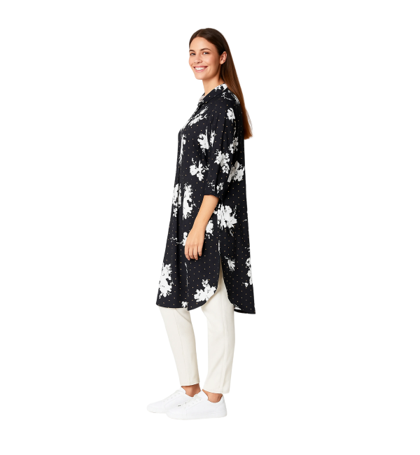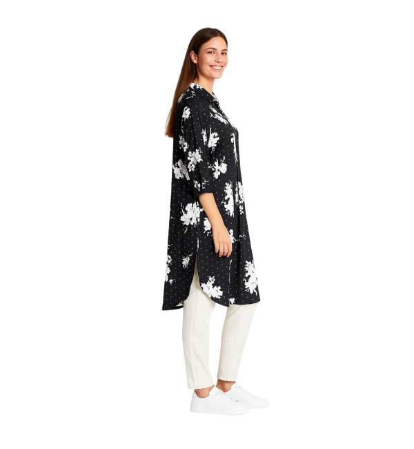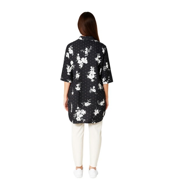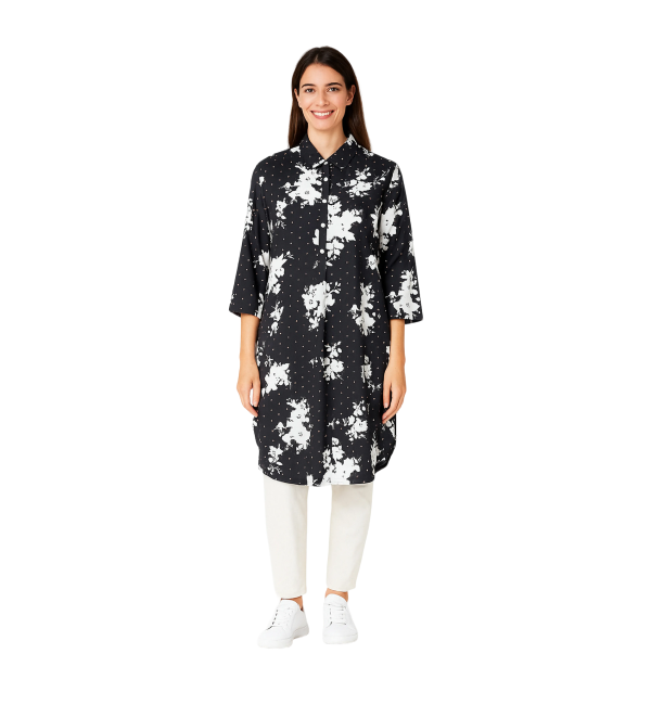 Striking long kurti crafted from 100 percent cotton, featuring a blend of printed detailing and elegant embroidery for a rich, refined look. The black base adds depth and versatility, making it suitable for both everyday wear and special occasions. Custom options in prints, colours and embellishment styles can be provided as per your preference.