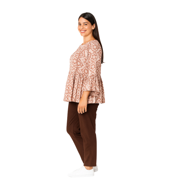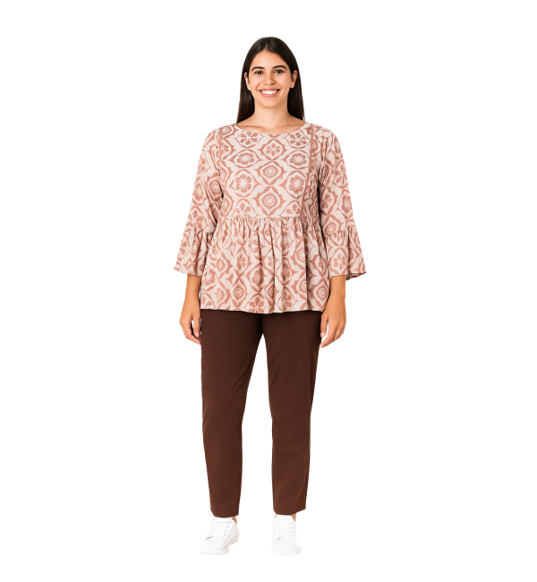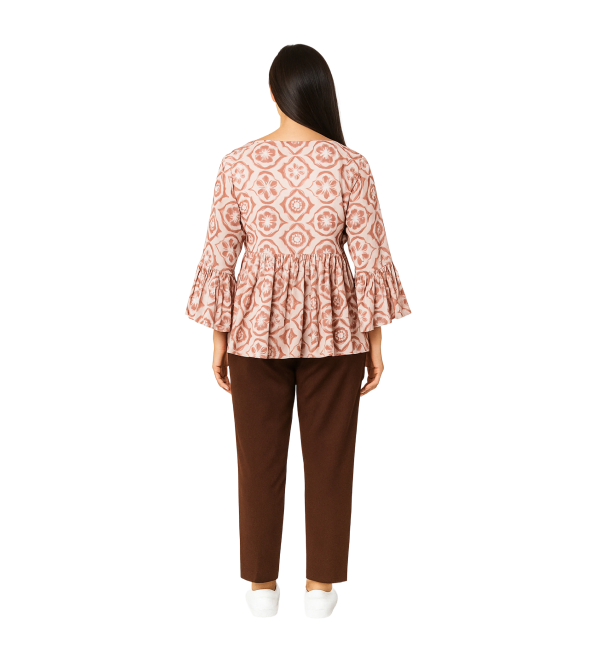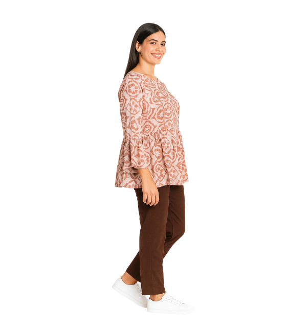 Chic peplum top crafted from 100 percent cotton in a soft pink printed fabric. The flared waist adds a feminine touch while keeping the silhouette light and flattering for everyday wear. Custom options in prints, colours and fabrics can be offered to suit your style preferences.