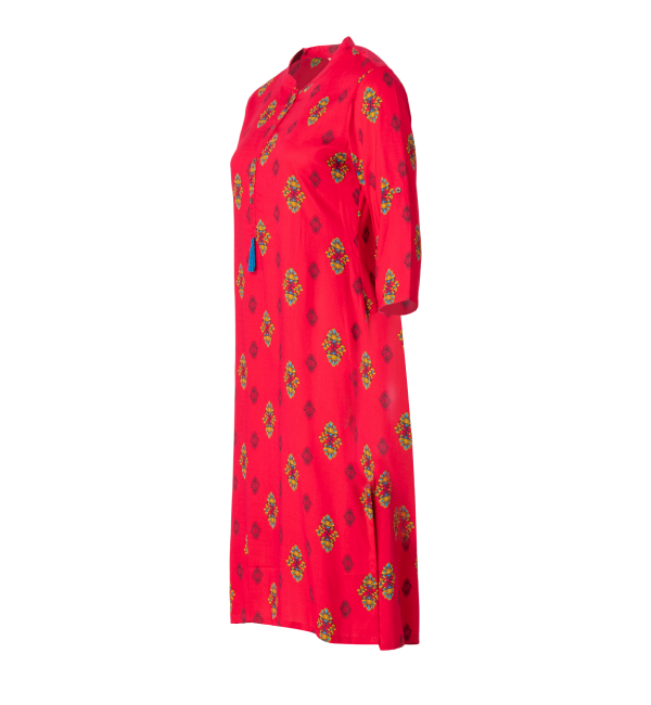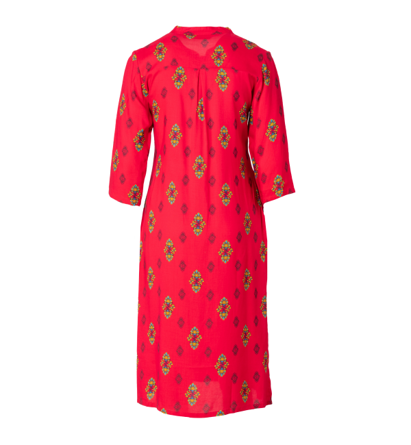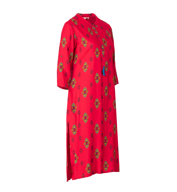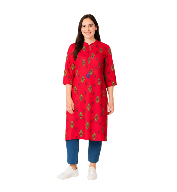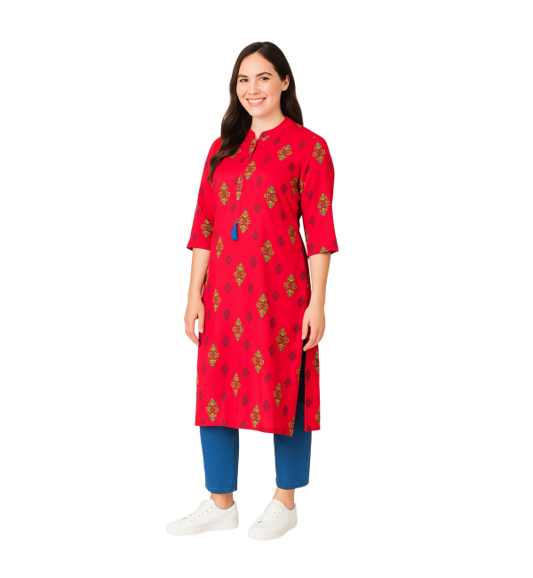 Vibrant long kurti crafted from 100 percent cotton and finished with an all-over red print for a bold yet elegant look. The breathable fabric ensures day-long comfort, making it ideal for casual outings or festive wear. Colour, print and design variations can be customised to match your preferences.