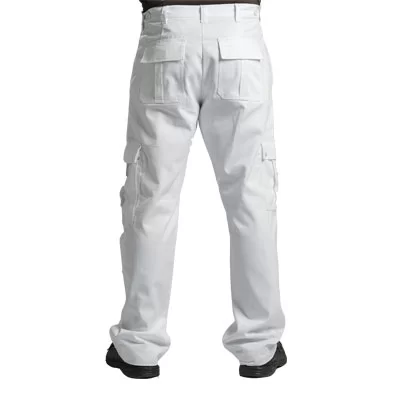 Essential work trousers in durable 240gsm cotton for everyday use. Zip front fly with plastic button waist closure. Features dual leg pockets with button flap closures and two back patch pockets secured with velcro flaps. Simple, functional design built for reliability and comfort. Customization available as needed.