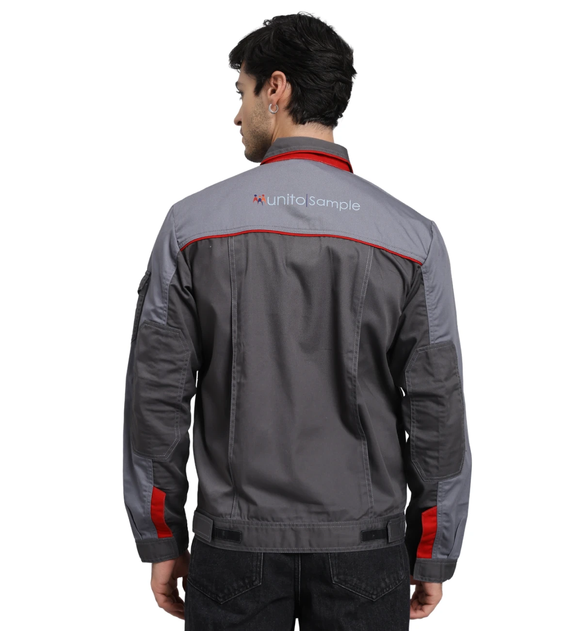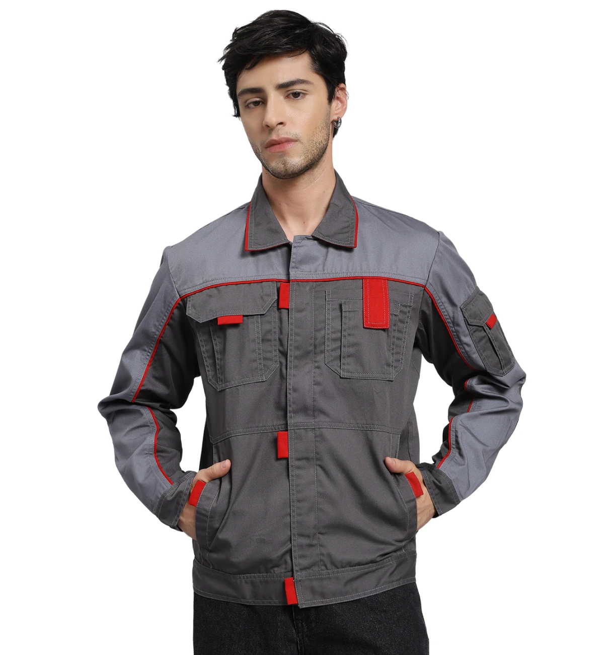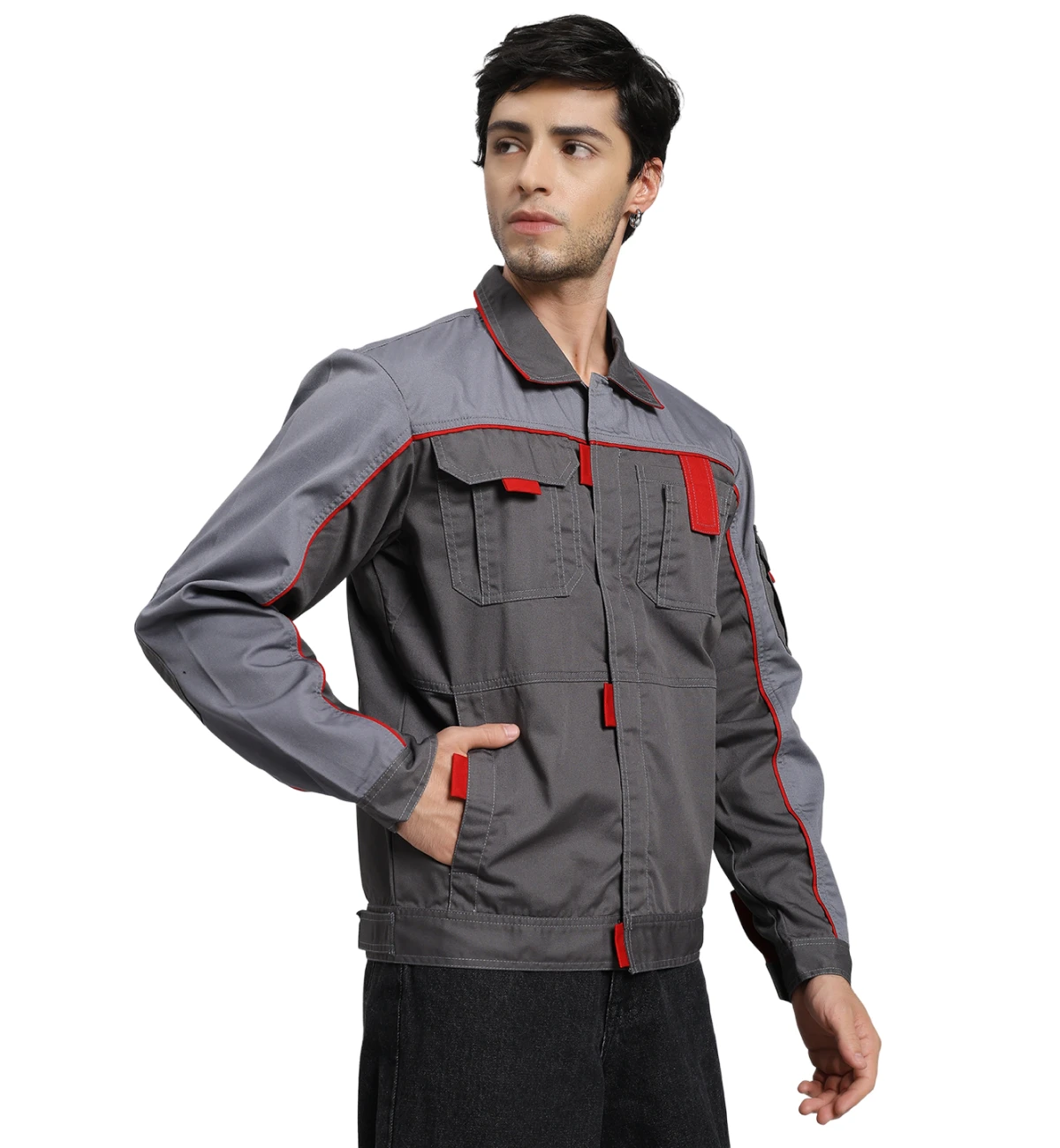 Crafted from an 80% cotton and 20% polyester blend, this jacket pairs black and grey panels with bright orange highlights for enhanced visibility and style. Built for durability and comfort, it can be customized in other color combinations.