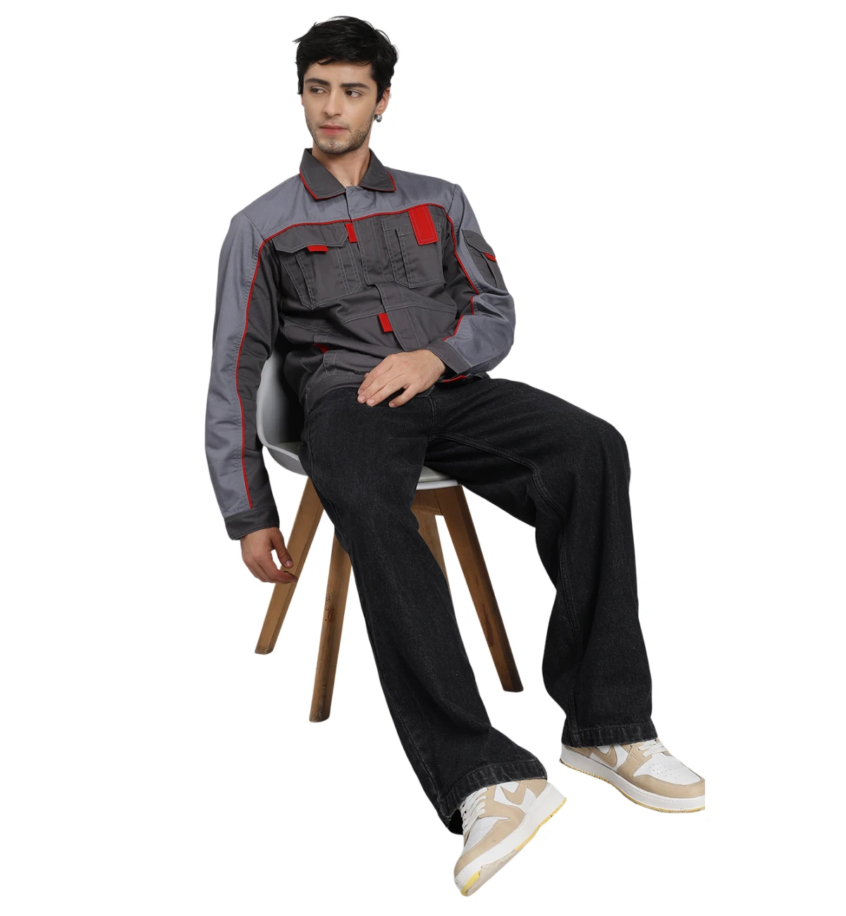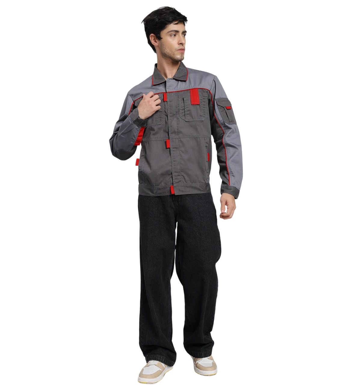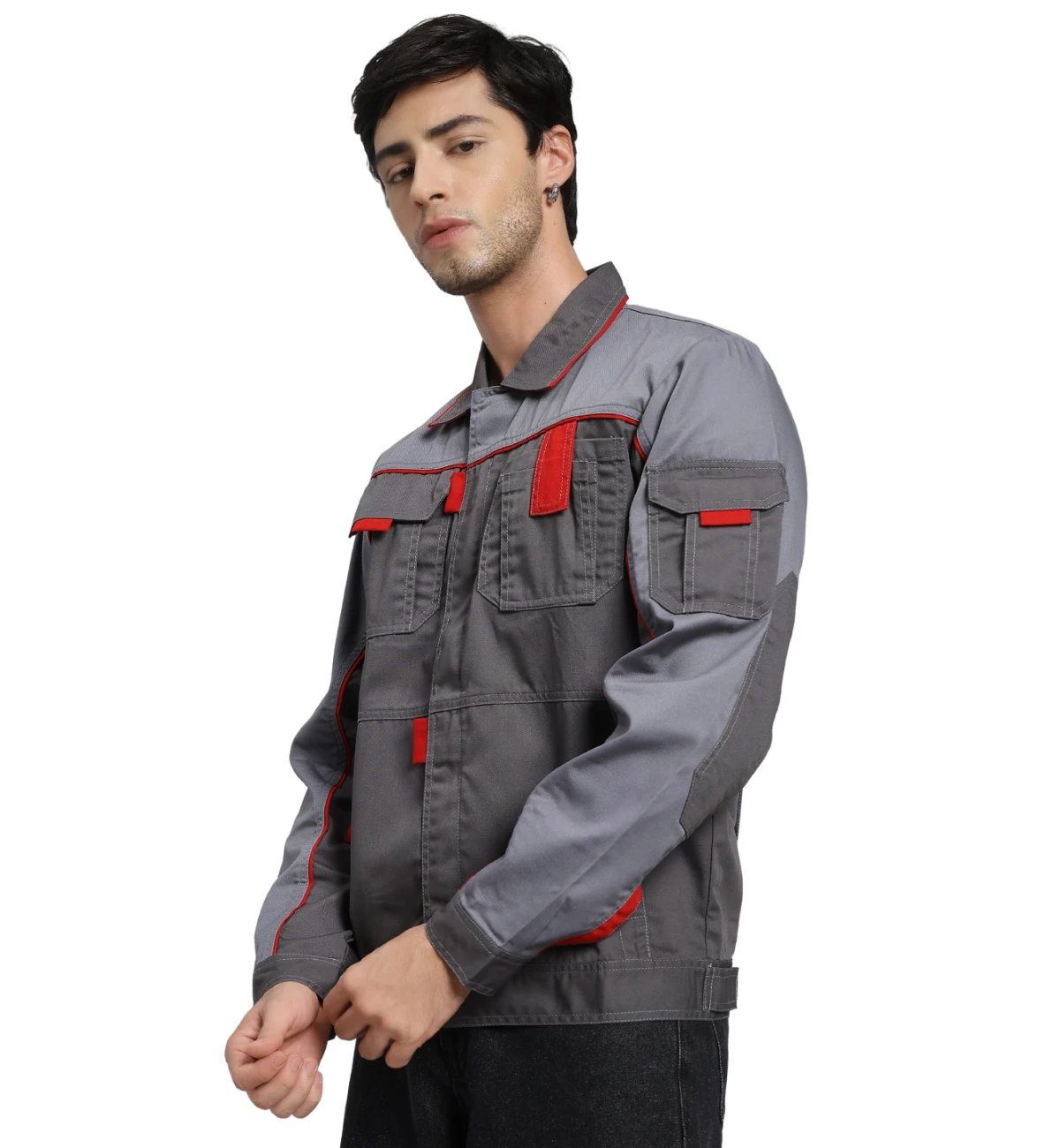 Crafted from an 80% cotton and 20% polyester blend, this jacket pairs black and grey panels with bright orange highlights for enhanced visibility and style. Built for durability and comfort, it can be customized in other color combinations.