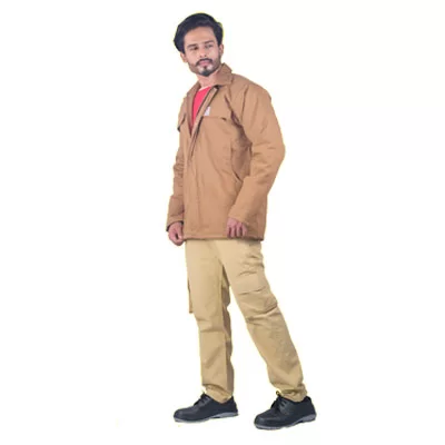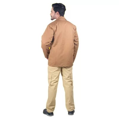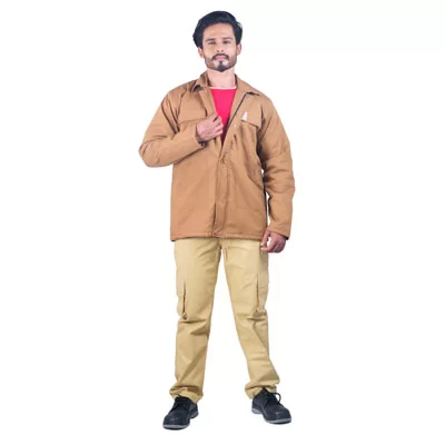 Heavy-duty safety jacket in 240gsm Proban-treated cotton for fire protection. Front zip closure concealed with protective flap for added security. Dual chest pockets with flap closures provide convenient storage. Button-secured front placket ensures reliable fit. Ideal for high-risk work environments. Can be customized.