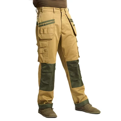 Heavy-duty work trousers in robust 245gsm poly-cotton blend. Features dual hanging front pockets, multiple leg pockets, and reinforced knee guards for maximum protection. Zip front fly with plastic button waist closure. Bi-color fabric on bottom hem and dual slanted back patch pockets add style. Customizable to your specifications.